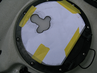 First job was to drawer around the hatch cover. I placed a piece of paper on the hatch infront of the hinges and rubbed around the edges to pick up the edge of the hatch and the toggle latch/handle. Then cut out the circle and hole for the toggle/handle.