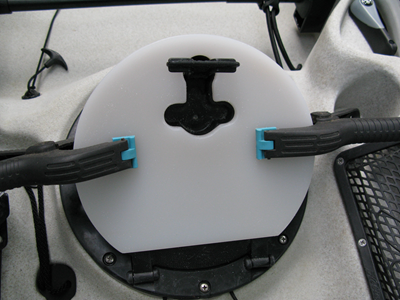 Check again that everything works by clamping the board in place on the hatch, make sure the toggle/handle can be got at and turned, that the hatch will open fully so that your tackle box or Hobie Gear Bucket can be removed easily when required.